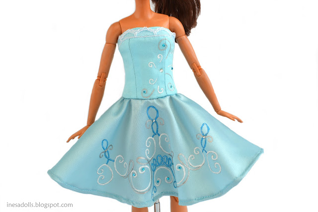 I love sewing clothes for dolls from cotton fabric. But this time, I decided to combine two fabrics: cotton and satin. I made the corset from blue cotton and the sun skirt from blue satin. I tried it, and now I know that I'm not a fan of satin because it's challenging to photograph bright satin due to the glare. However, it's effortless to handle the edges of satin fabric. I enjoy working with cotton and knit fabrics. And, of course, I added my touch — I painted a design on the corset and the skirt using fabric paints. I love painting doll clothes and adding rhinestones.